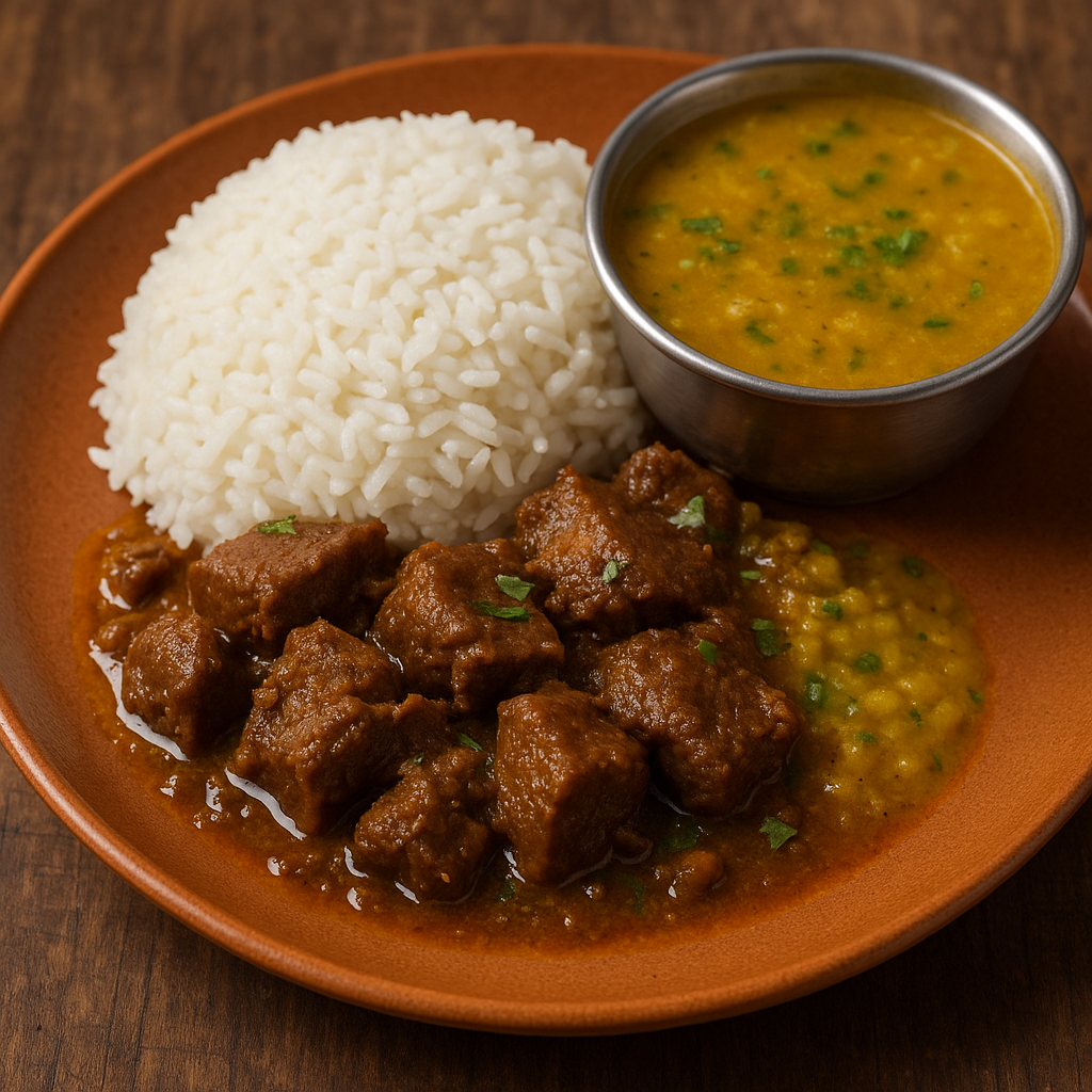 ভাত ,মাংসের ঝোল ,দল,ভর্তা