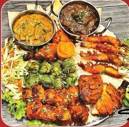 Fried rice,Chicken tandoori, tawa kabab, Green Adanan kabab, prawns kabab, butter chicken, beef curry, vegetables, nana